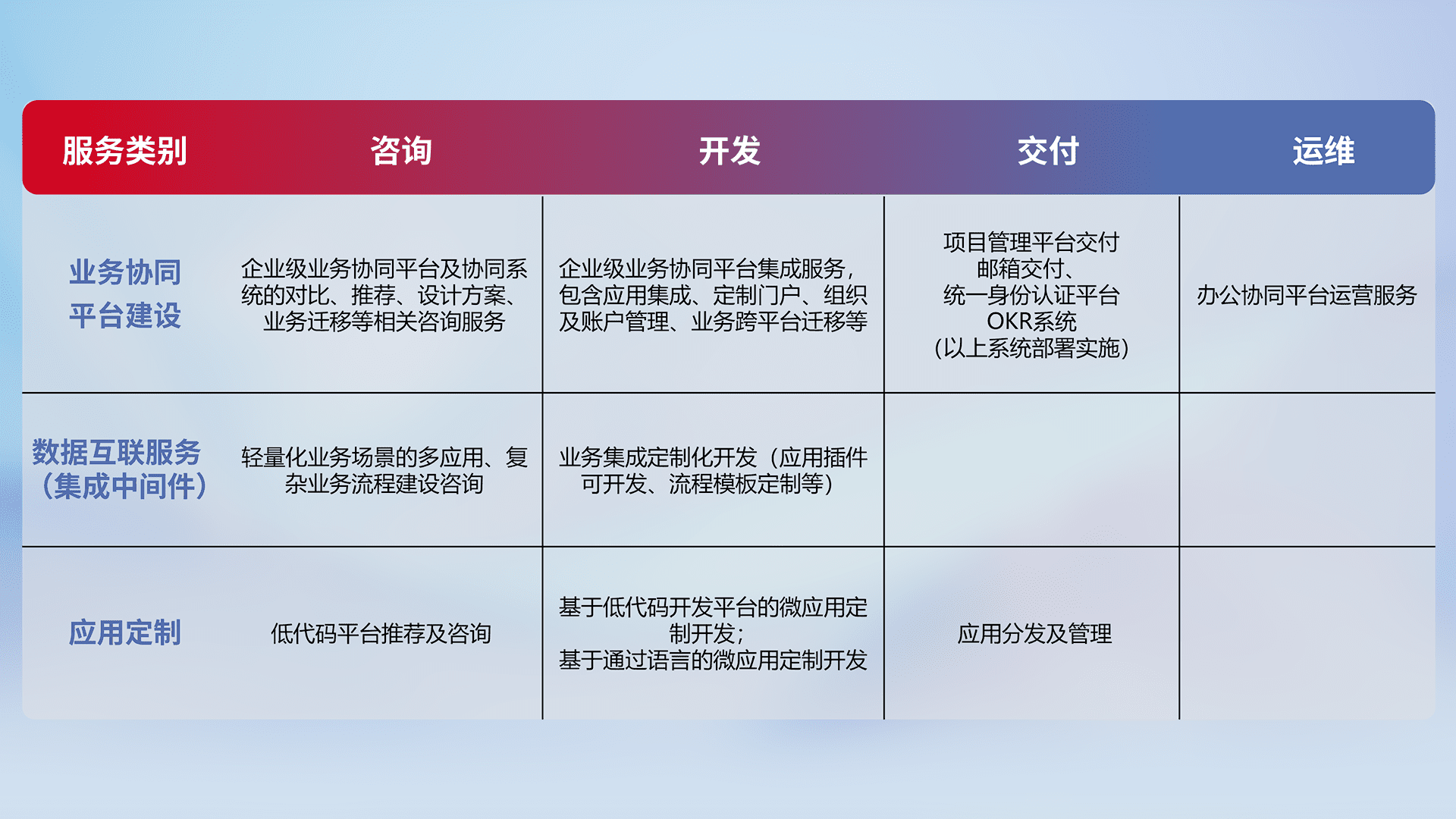 针对钉钉、、、、企微、、IDaas等平台级产品提供产品的规划、、方案、、交付、、、定制化开发等服务,,实现如统一协同办公、、智能客户服务、、、、混合会议管理、、、、智能数据查询、、、、等业务场景,,,实现数字化转型。。。
